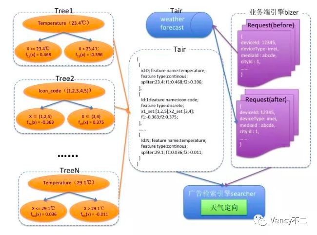 离线建模:以转化为目标,搜集一段时间的历史点击数据,对数据进行特征化处理,最终训练出合适的离线模型,每个行业训练一个模型。去掉了Gentle AdaBoost最后的感知器模型,直接使用回归函数的和作为打分。而且,在每次迭代过程中,我们会保留当前错误率,当迭代达到一定次数,而错误率仍大于给定阈值时,则直接舍弃对该行业的训练,即在天气场景定向中,不对该行业的广告打分,阈值可动态配置。另外,考虑到线上加载迭代模型会牺牲性能,我们将迭代轮次控制在100次以内。最终结果会存在Tair缓存中,其中key为一级及二级行业,value即为AdaBoost模型的多轮迭代结果,同时保留了最后一轮迭代的错误率。