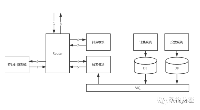 Router:对外提供HTTP服务,接收请求后,依次与特征计算系统、检索模块、排序模块交互,最后返回出价和广告等,是枢纽。
