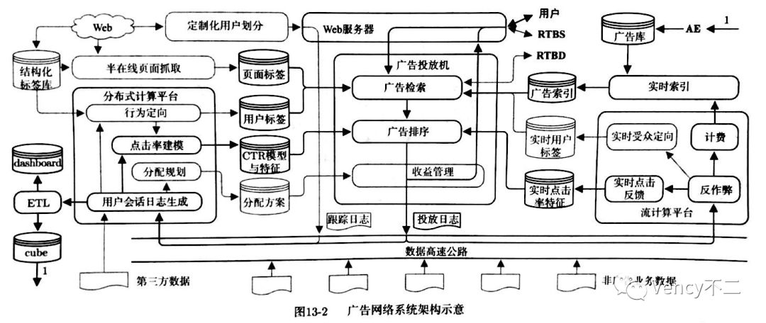 总结如下:1.广告跟踪日志和投放日志接入数据高速公路,由数据高速公路把数据运到分布式计算平台和流计算平台。2.分布式计算平台周期性以批处理的方式加工数据,得到数据和模型,存到内存中方便调用。3.流计算平台以流处理的方式加工最近一小段时间的数据,得到数据也存到内存中方便调用。