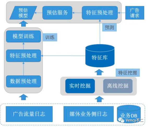 从上图中可以看到,特征挖掘分实时和离线两种方式,实现逻辑基本一致,但是计算设施和时效性不同。从特征库输出的会用于离线的模型训练和在线的预测,其中的特征预处理实现逻辑也基本一致,因为训练后的模型参数生成预估模型,用以预估服务。