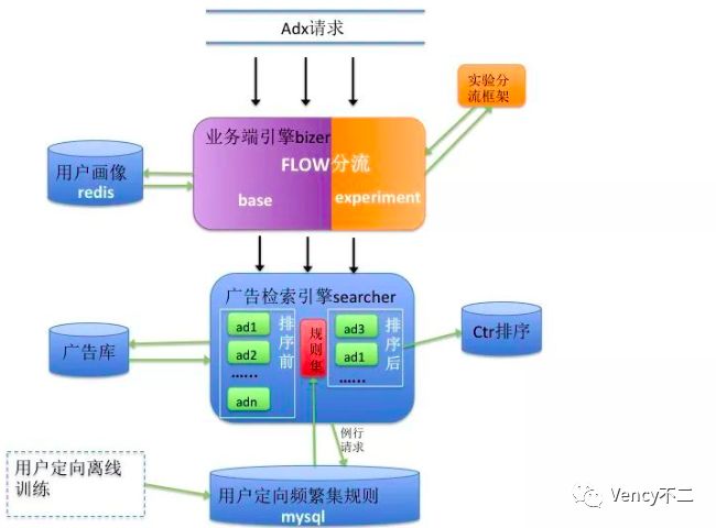 FLOW分流,是指在请求进来之后会划分一定百分比的流量作为实验流量,用于用户定向实验。会分析一段时间的累计实验结果,与base分流额作对比,以检测用户定向策略带来的效果提升,并反馈给频繁集模型,以干预调整离线产出模型。
