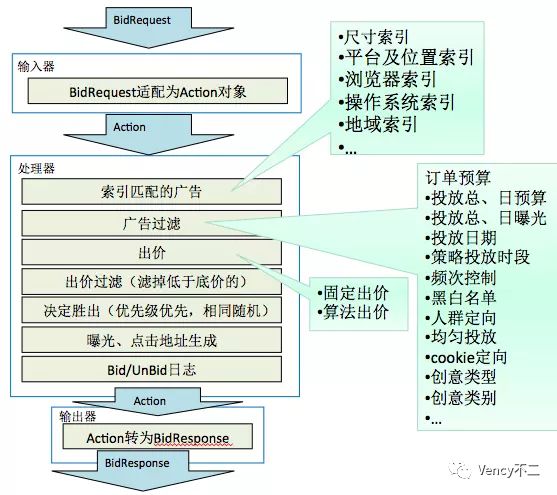 重点看下处理器,根据上图处理器中包含索引匹配、广告过滤、出价、出价过滤、决定胜出、曝光点击地址生成、Bid/UnBid日志等。索引匹配是指根据媒体条件索引出匹配的广告,广告过滤指根据广告条件过滤掉不合适的广告。出价、出价过滤和决定胜出就是精排里的内容,粗排这里没说明。