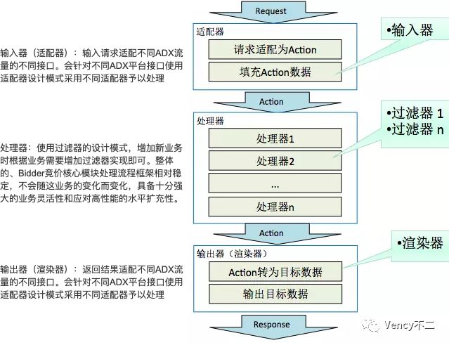 接下来看下竞价核心的处理流程,分适配器(输入器)、处理器、渲染器(输出器)。