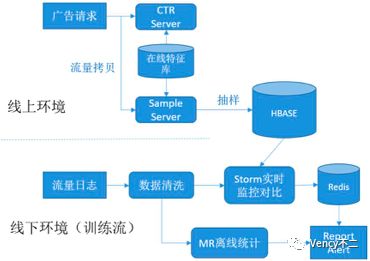 如上图所示,从线上真实业务环境copy广告请求流量到sample server,按规则抽样后将完整请求及特征数据写入HBASE中,包括query信息以及订单信息。sample server和ctr server在特征处理实现上保持一致。线下环境,基于storm实现针对曝光日志的实时监控,从全量曝光日志中抽取请求id与Hbase中匹配的记录,检测某个特征纬度值是否一致,并同时统计关键特征纬度分布。离线MR程序会统计全量日志中的各特征值分布。特征的一致性以及分布统计会定时发送report,异常波动达到设置阈值则会触发告警,提醒相关人员介入。