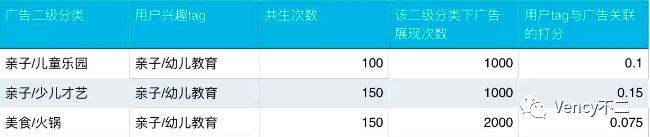 离线建模:由于广告商户分类分三级,每一条点击记录都拆分成多份,让每一级的分类都能和用户标签关联,保证每个层级都不会遗漏。通过Spark的ML库找出大量频繁集以后,剔除掉仅包含广告分类或用户标签的。并限制用户标签在频繁项中的数据,不超过两个,以保证覆盖较多用户。然后对广告分类与兴趣标签的关系打分,广告分类A与兴趣标签B的打分为 ,并考虑到广告展示量对点击的影响,最后得到下表。