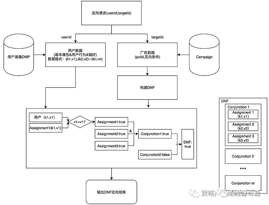 一个定向请求包括userid和targetid,根据userid去取用户标签,根据targetid取广告的定向包,把定向包解析成DNF的形式(建立倒排索引),与用户标签进行匹配。