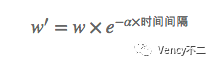 此方案核心是新老数据的合并,如果新数据包含老数据中的分类&商圈,则用新数据中的权重;若未包含,则对老数据中的分类&商圈权重衰减,若衰减后小于阈值,则提出此分类&商圈。衰减方案是根据时间衰减,使用牛顿冷却定律,默认半衰期为72小时(不同的店铺分类给予不同的半衰期),使用牛顿冷却定律,参数计算公式为:0.5 = 1 × e-α*时间间隔 ,解出α,并带入下面公式得到实际权重为: 其中,w为老权重,w'为新权重。