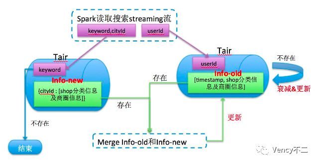实时流计算:因为关键词的时效性,除了离线以外,也用实时流计算处理用户行为,并把最后的结果保存在Tair集群。首先通过Kafka订阅用户行为实时流,以五分钟为时间片处理用户行为,查找用户ID和搜索词,如果搜索词过长,则进行分词,接着从Tair中查找出与该搜索词相关的店铺及店铺分类和打分(离线模型给出)。然后在Tair中查找该用户ID是否有历史结果,若有,则读出,对之前的打分进行衰减(衰减方案见下文),并与当前新的打分进行合并;否则,将新的数据及时间戳写入Tair。该方案的流程图如下: