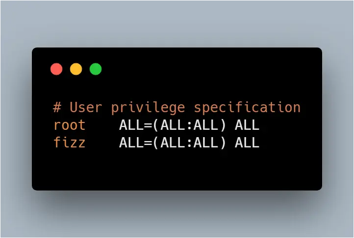 接下来打开/etc/sudoers文件,gedit或者vim都行,这里直接用vim打开,在# Use privilege specification添加fizz ALL=(ALL:ALL) ALL,意思是fizz的所有权限为超级管理员所有的命令对于fizz用户都适用;