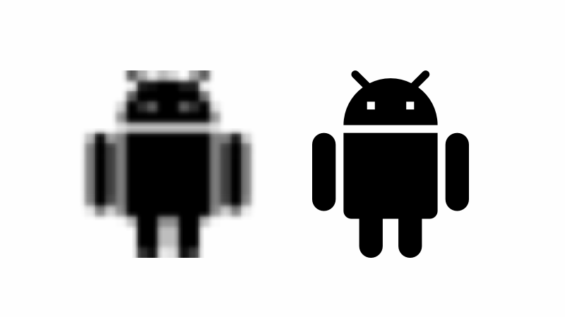 矢量图可以优雅的调整大小;这是因为它们将图像绘制在抽象大小的画布上,你可以放大或缩小画布,然后重新绘制对应尺寸的图像。但是,位图资源在重新调整大小后会变得很糟糕。缩小栅格资源是 OK 的(意味着会丢失一些信息),但是放大它们会导致模糊或者色带状的失真,因为它们必须插入缺失的像素。