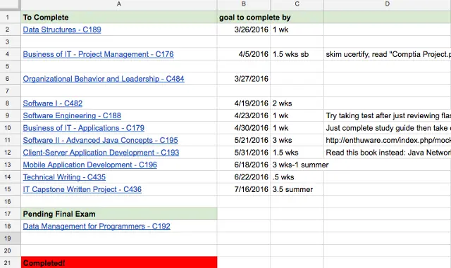 我花了很多时间浏览我大学的 Reddit 页面和各种论坛,阅读其他人分享的对他们的学习有益的方法。有很多资源可以用于辅助修一个行业证书。这些都帮助我更好地计划最快的路径。