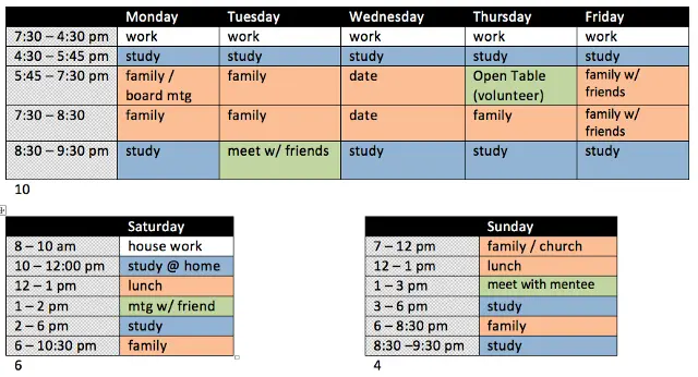 我创建了详细的每周时间表,以保证在花大量时间学习的同时能够兼顾我的家庭和其他事情。我安排了家庭聚会时间,志愿服务时间,朋友聚会时间,以及每周约会之夜!