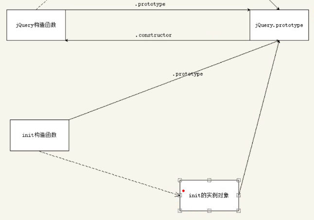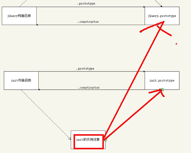 }经过这么一改,this的指向发生了变化,原本存放在jQuery原型上的dom对象们,现在变成了init的儿子,this指向了init。但是我们的方法都是存放在jQuery原型上的,难道还要手动搬回来?算了算了,太麻烦,还好有原型链这个好东西。手绘了一张草图,将就看一下: