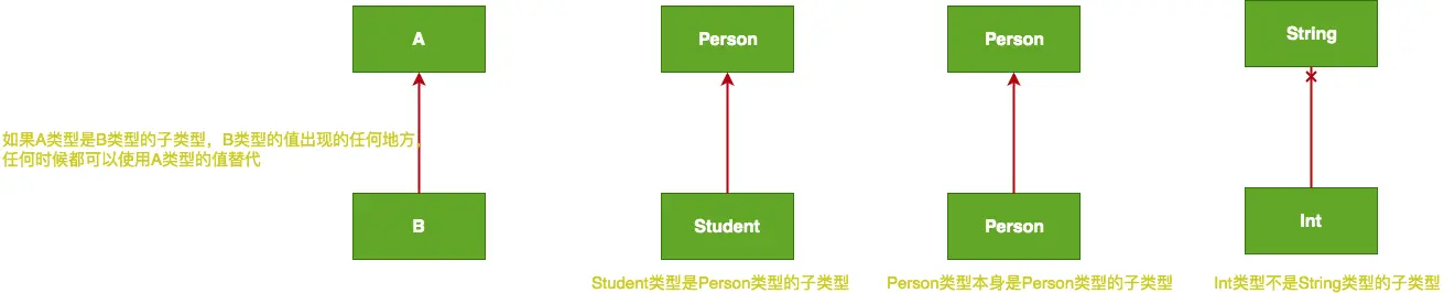 注意: 某个类型也是它自己本身的子类型,很明显Person类型的值任意出现地方,Person肯定都是可以替换的。属于子类关系的一般也是子类型关系。像String类型值肯定不能替代Int类型值出现的地方,所以它们不存在子类型关系