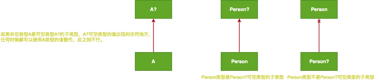 再来看个例子,所有类的非空类型都是该类对应的可空类型的子类型,但是反过来说就不行,就比如Person非空类型是Person?可空类型的子类型,很明显嘛,任何Person?可空类型出现值的地方,都可以使用Person非空类型的值来替换。其实这些我在开发过程中是可以体会得到的,比如细心的同学就会发现,我们在Kotlin开发过程,如果一个函数接收的是一个可空类型的参数,调用的地方传入一个非空类型的实参进去是合法的。但是如果一个函数接收的是非空类型参数,传入一个可空类型的实参编译器就会提示你,可能存在空指针问题,需要做非空判断。 因为我们知道非空类型比可空类型更安全。来幅图理解下: