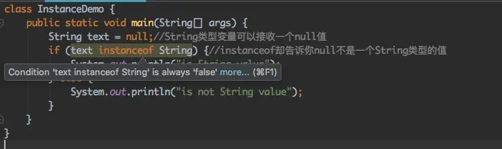 貌似连Java中的instanceof都不承认null是一个String类型的值。这两种值的操作也完全不一样: 真实的String允许你调用它的任何方法,而null值只允许非常有限的操作。那么Kotlin类型系统是如何解决这样的问题的呢? 请接着往下看。