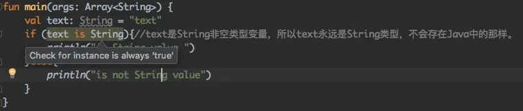var msg: String 这里我们可以说String类和msg变量的类型是一致的。但是在Kotlin中还有一种特殊的类型那就是可空类型,可以定义为var msg: String?,这里的String类和msg变量的String?类型就不一样了。所以在Kotlin中一个类一般至少对应两种类型. 所以类和类型不是一个东西。