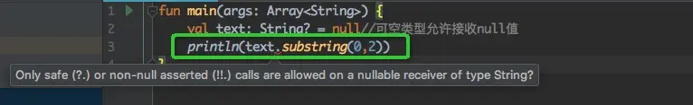 text?.substring(0,2) //相当于 if(text != null) text.substring(0,2) else null