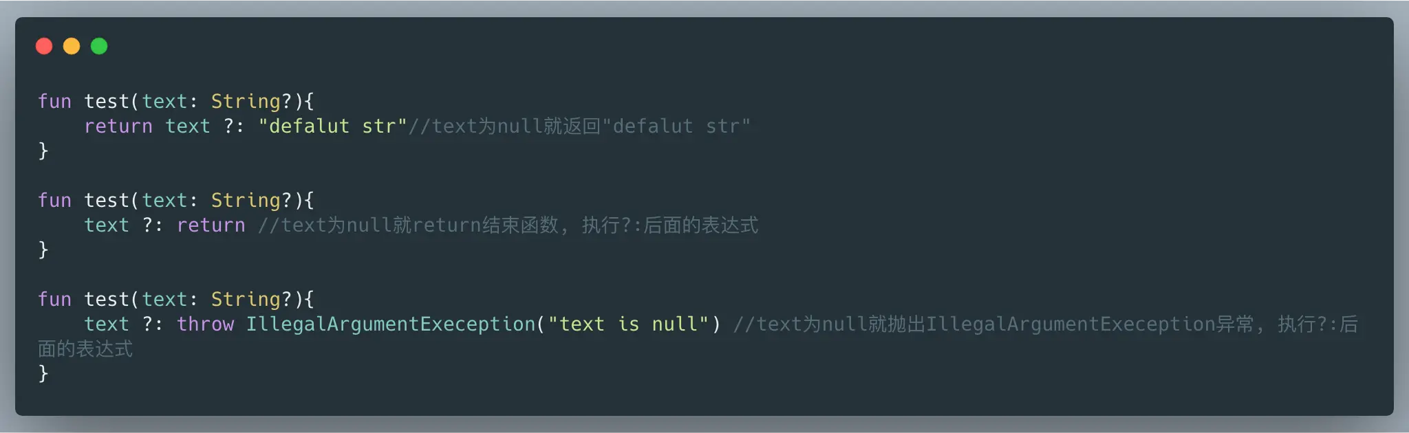 如果?:前面表达式为null, 就执行?:后面的表达式,它一般会和?.一起使用。(注意: 它与Java中的? xxx : xxx 三目运算符不一样) carbon (29).png