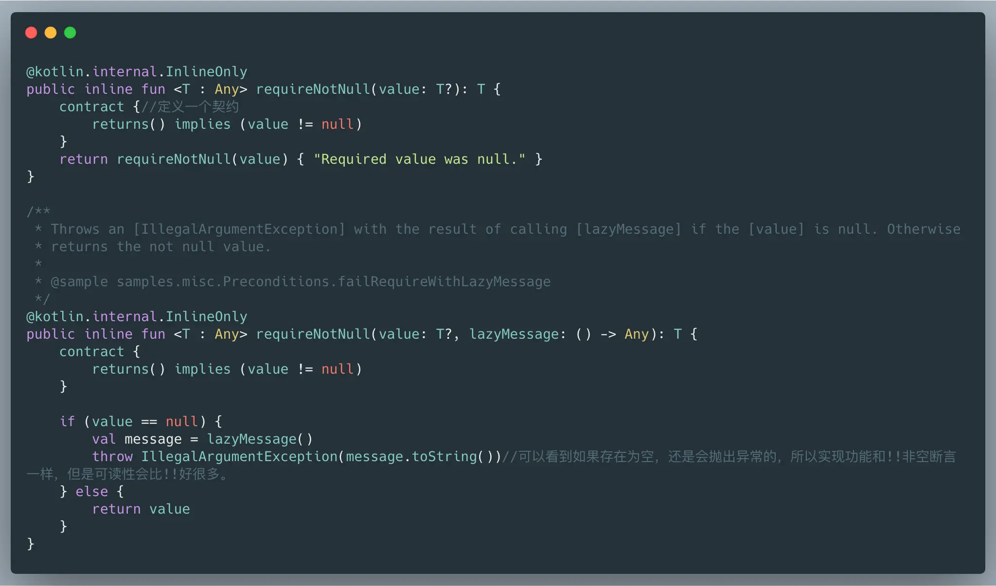 针对上述问题,除了之前文章中给出解决方案,这次又提供一个新的解决方案,那就是契约(实际上主动告诉编译器某个规则,这样它就不会提示做判空处理了) 契约官方正式提出来是Kotlin1.3的版本,虽然还处于Experimental(比如自定义契约)中,但是实际上Kotlin内部代码,早就使用了契约。具体使用可参考我之前的一篇文章 JetBrains开发者日见闻(二)之Kotlin1.3的新特性(Contract契约与协程篇) 一起来看下内置契约是如何解决这个问题的。