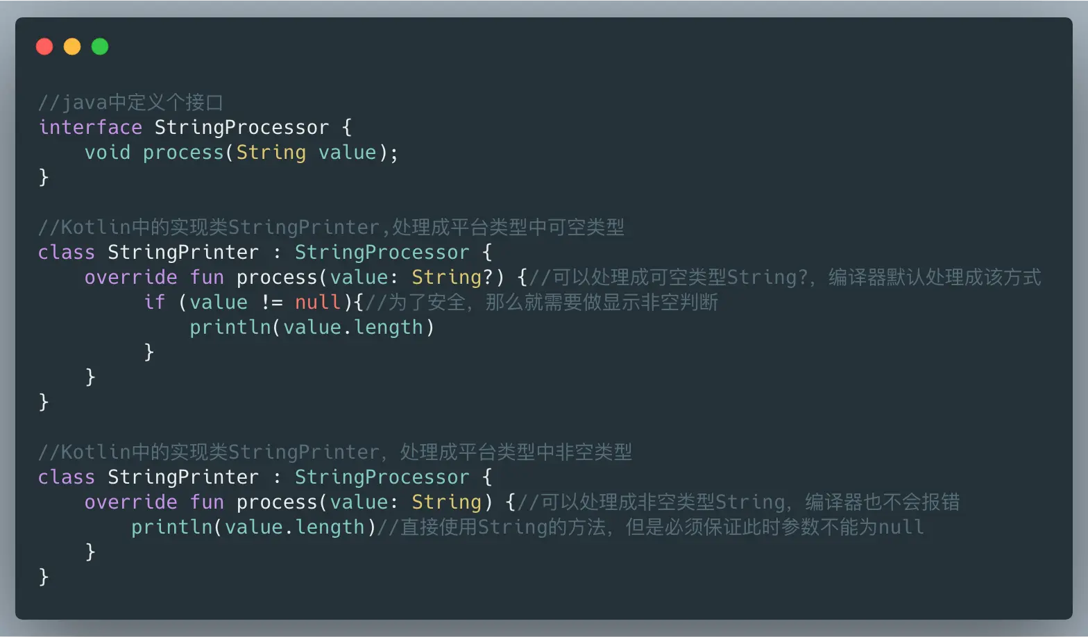 所以Kotlin引入一种新的概念叫做: 平台类型,平台类型本质上就是Kotlin不知道可空性信息的类型,既可以把它当做可空类型又可以把它当做非空类型。 这就意味你要像Java代码中一样对你在这个类型上做的操作负全部责任,说的有味道点就是你在Java中拉的便便,Kotlin是不会给你擦屁股的。所以对于Java中函数参数,Kotlin去调用的时候系统默认会处理可空类型(为了安全性考虑),如果你明确了不为空,可以直接把它修改为非空类型,系统也是不为报编译错误的,但是一旦这样处理了,你必须保证不能为空。