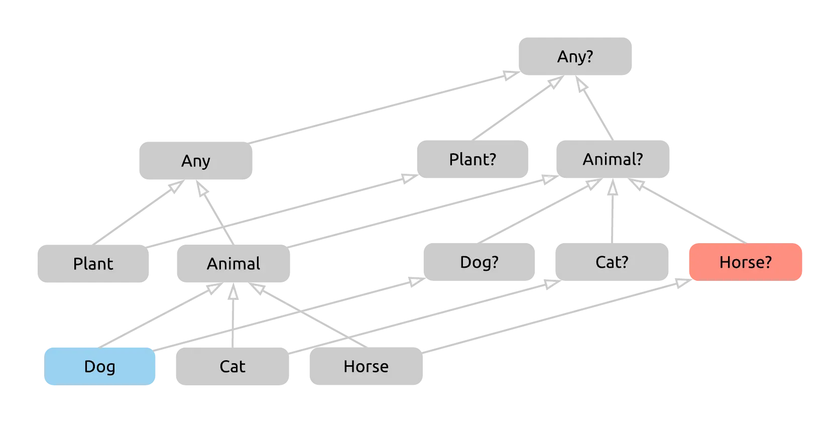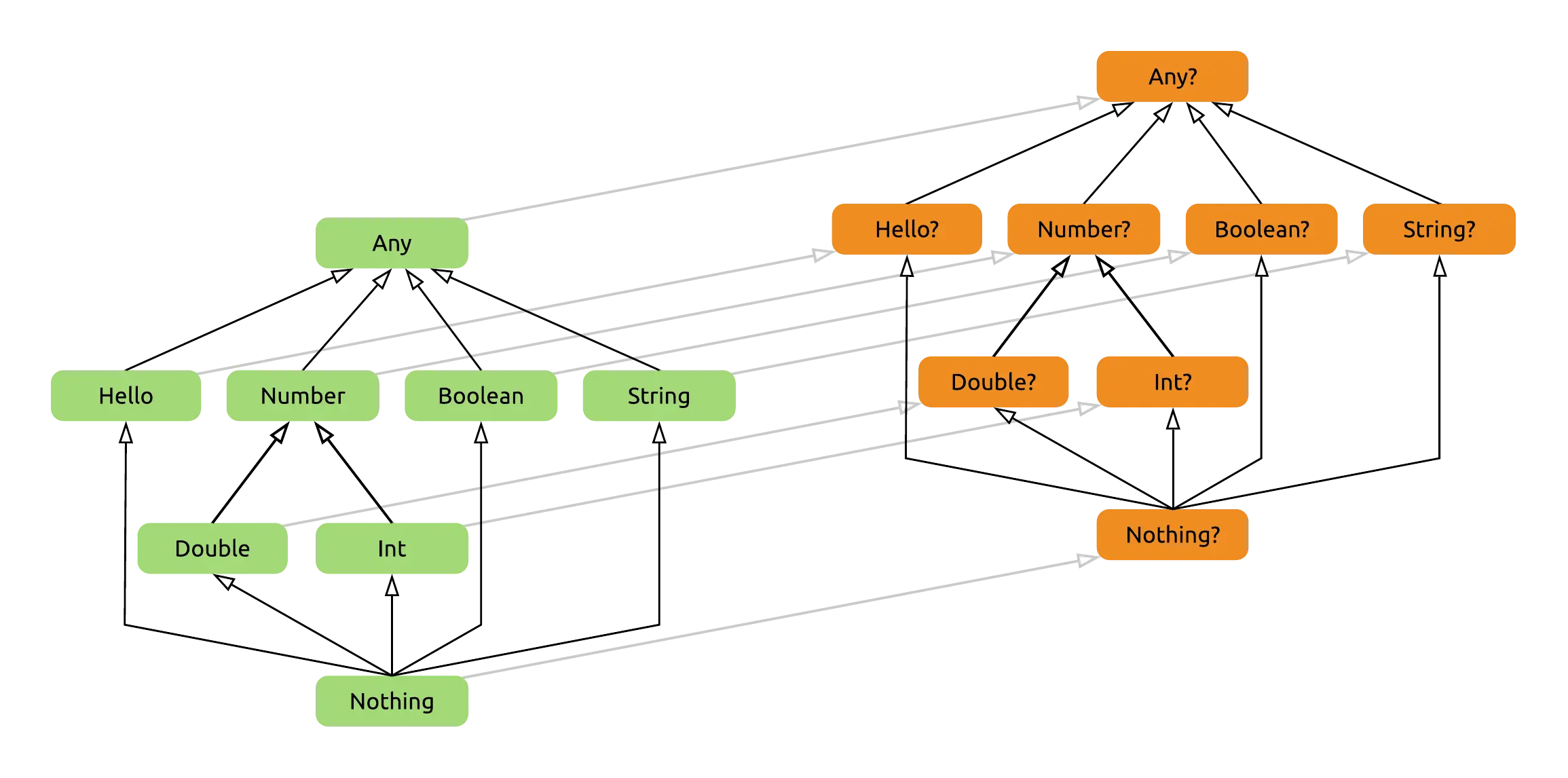 Nothing类型是所有类型的子类型,它既是所有非空类型的子类型也是所有可空类型的子类型,因为Nothing是Nothing?的子类型,然而Nothing?又是所有可空类型的子类型。 具体可以看下如下的层次结构图: