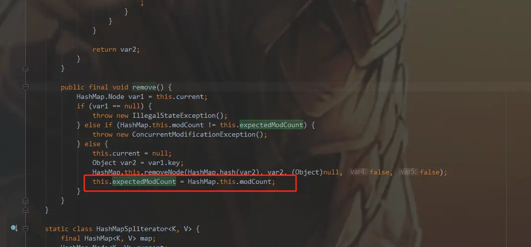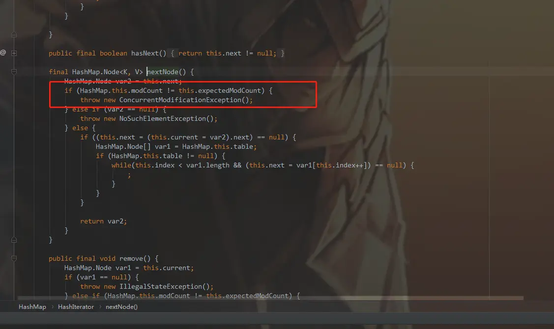 - 每次进行hashmap.remove操作的时候就会对modCount+1,此时迭代器里的expectedModCount还是之前的值。