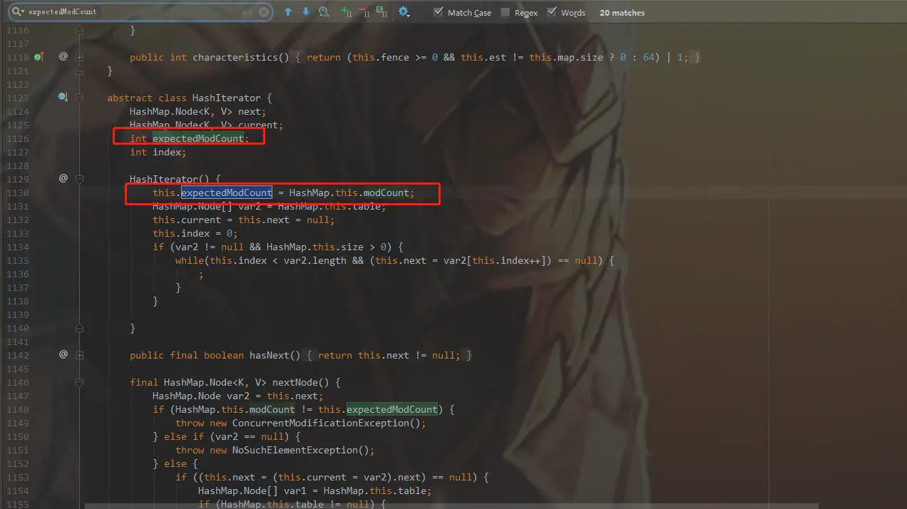 这里对modCount进行了自增操作,表示操作动作+1。再看modCount和expectedModCount是什么东西