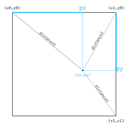 通过三角形三边关系公式,可以计算出上图中px和py的长度,也就是当前点在当前正方形网格中的坐标。