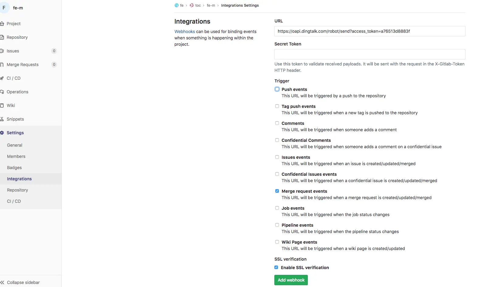 第二步: 在gitlab的仓库中找到setting->Integrations, 把机器人生成的webhook链接填加到这里,再把监听勾选merge request events, 当然你也可以勾选其他的监听。