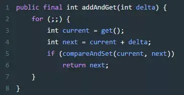 下面找一个方法 getAndIncrement 来研究一下 AtomicInteger 是如何实现的,比如我们常用的 addAndGet 方法: