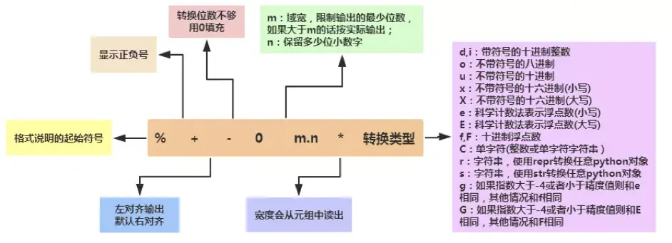 Python中的print函数非常强大,支持把各种类型的数据直接转成字符串的形式输出,也支持格式化输出,通过「%百分号」进行间隔,完整规则如下图所示: