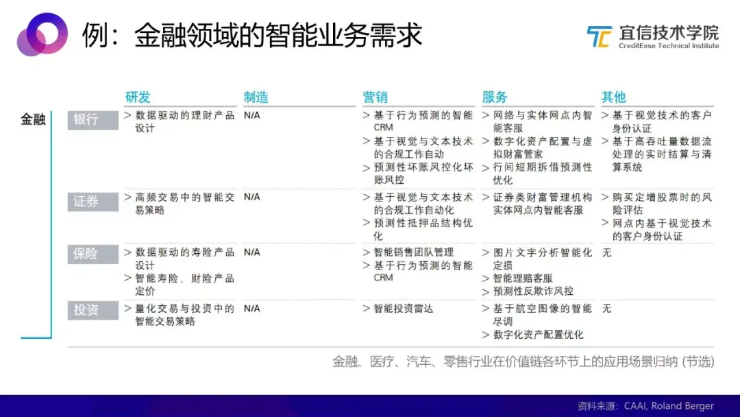 上图是一个示例,数据来源于Roland Berger。宜信作为一家金融科技公司,更多面对的是金融领域的智能业务需求。从图中可以看到在金融这一个领域之内就有这么多环节已经形成了标准化的智能应用,可想而知在今天企业业务的发展过程中智能化正在扮演一个多么重要的角色。
