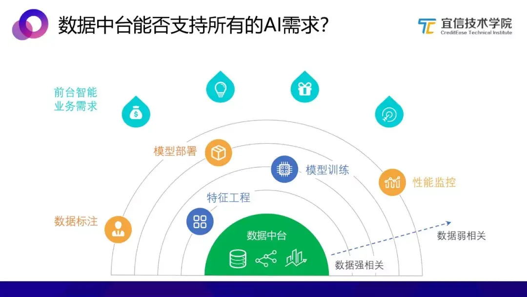 每一项能力都需要耗费大量的人力物力和时间来进行开发,而且由内而外的能力扩展与数据本身的相关性是由强至弱的,也就是说随着能力层次的不断扩充,数据中台逐渐偏离了其“以数据为核心”的宗旨,而且也会使得数据中台变得臃肿复杂,在对接前台业务需求的时候,也可能会带来更多复杂性的问题。因此数据中台可以一定程度上支持智能化业务需求,但如果想单靠数据中台来支持所有智能化业务需求显然不是最佳选择。