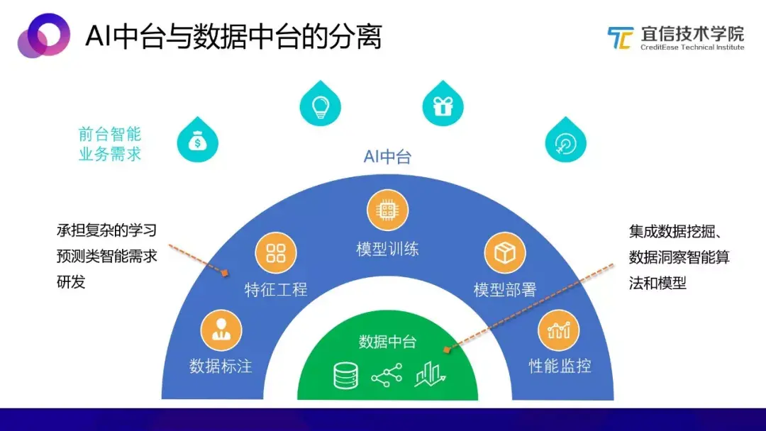 而数据中台以数据为核心,其智能化能力若想支持到以上所有环节,工作量绝对不小,并且会偏离数据中台的原有目标,因此让数据中台承担全部的智能化业务支持是不合适的。