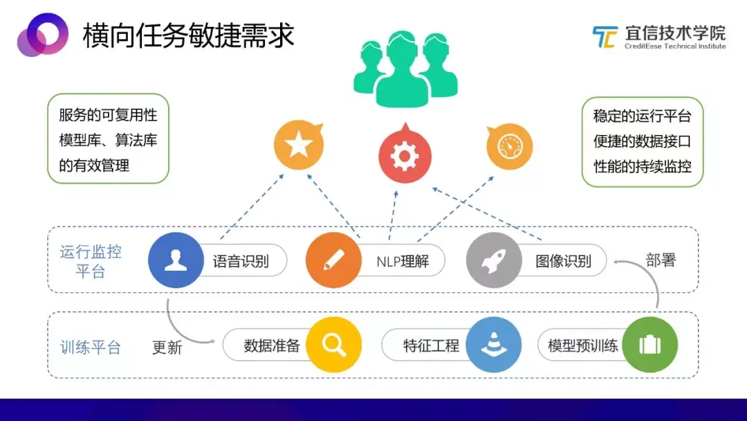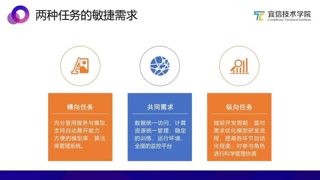 但另一方面,在两类任务的实施过程中,其敏捷化需求存在着不同,对AI中台应该提供的服务需求也不同。相对而言,横向任务的敏捷化比较容易实现。
