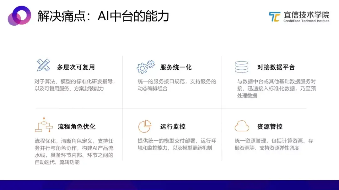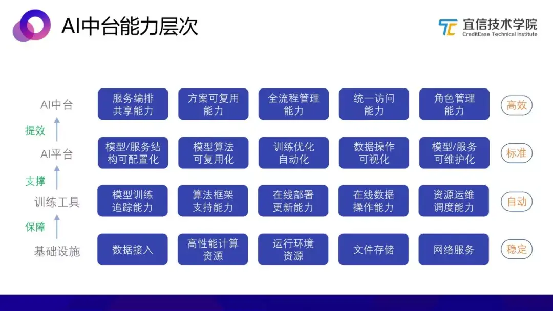 AI中台实际上是对现有能力进行整合串联,实现生命周期的管理,包括服务编排共享能力、方案可复用能力、全流程管理能力等,在标准之上实现提效,达到高效的目的。