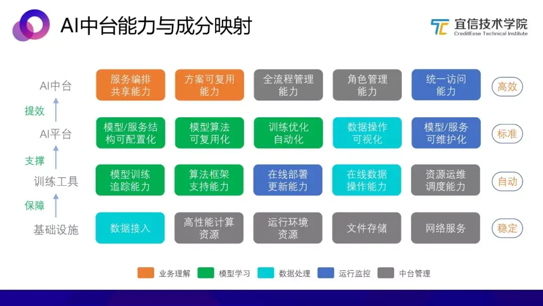 上图将AI中台能力分别与成分、平台进行映射,并且以颜色进行区分与对应。