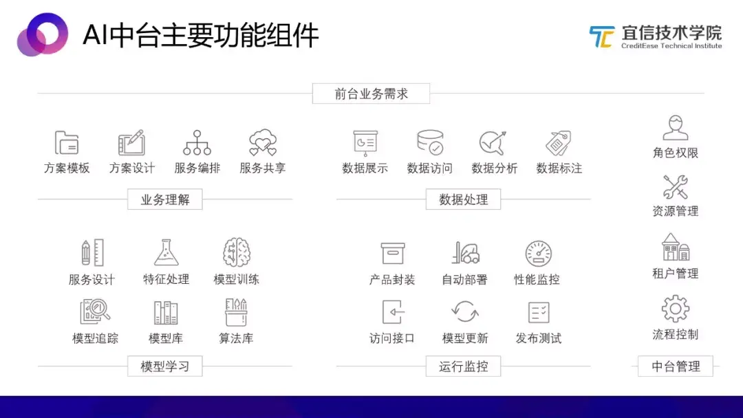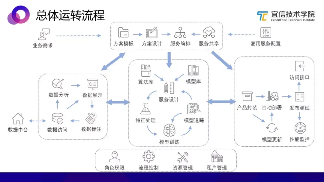 中间部分从上而下分成业务理解、模型学习、数据处理三大板块;右侧的运行监控对产品和模型进行统一封装、对外统一的访问接口等;左侧是贯穿于整个流程始终的平台管理,包括角色权限、租户管理、流程控制、资源管理等。