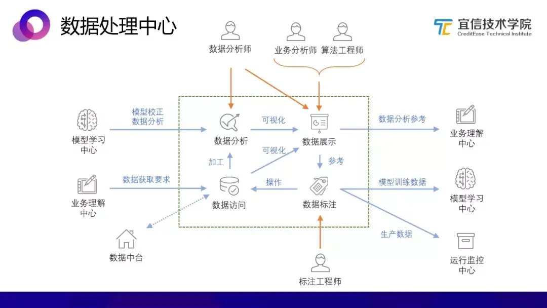 业务需求进来之后,先从数据处理中心获取数据分析和参考,采集数据样本提供可视化支持;