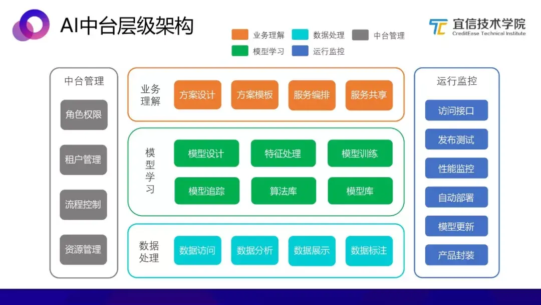 AI中台的层级架构如上图,AI中台处于数据模型服务与业务解决方案之间,向上连接业务向下沟通数据,每一个层级都有其可复用的机制。