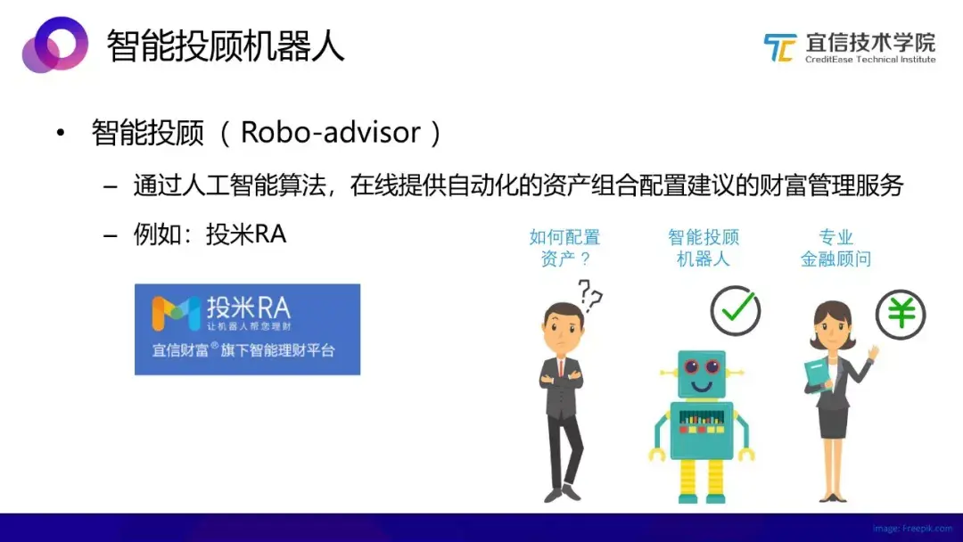 智能投顾是通过人工智能算法,在线提供自动化的资产组合配置建议和财富的管理服务。例如宜信旗下的智能理财产品:投米RA,就是通过智能化的方式帮助用户做科学的资产配置,从而实现财富管理方式的升级。