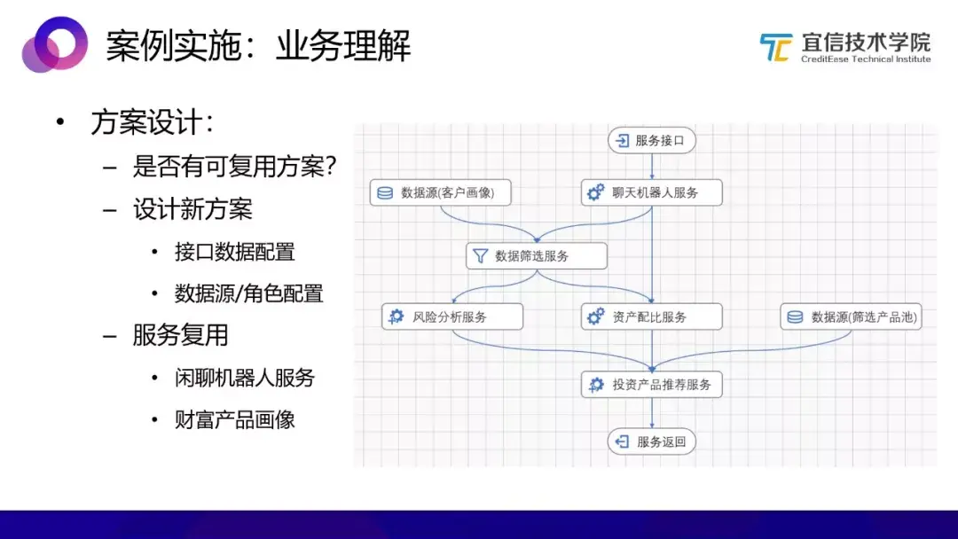 上文对中台实施路线进行了较为详细的介绍,本节将结合宜信内部智能投顾机器人的实践案例分析AI中台如何解决实际业务中的智能化需求。(由于智能投顾机器人是一个比较大的解决方案,此处做了适当抽象和缩减。)