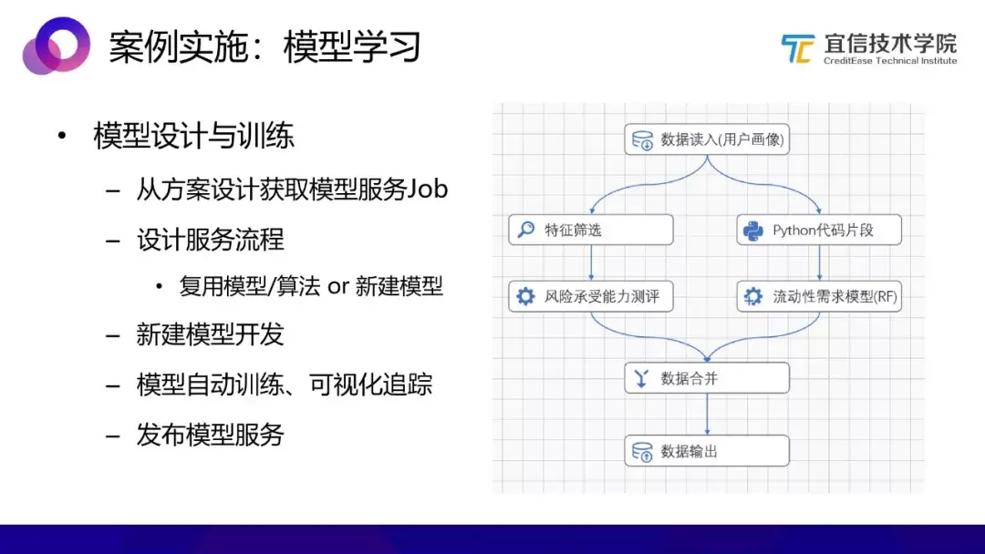从方案设计获取模型服务job,设计服务流程,它的输入是一个筛选后的用户画像,如上图右侧的结构所示,设计了两个比较简单的模型:一个是风险承受能力测评模型,这个模型之上还复用了一个已有的特征筛选模型,配合将用户画像里适合模型的有用特征提取出来并输入到模型中;另一个是流动性需求模型,评估资产需求,这里加了一个Python的代码片段对用户画像的数据进行加工再输入模型中。底下还新建了一个模型,对数据进行合并和输出。