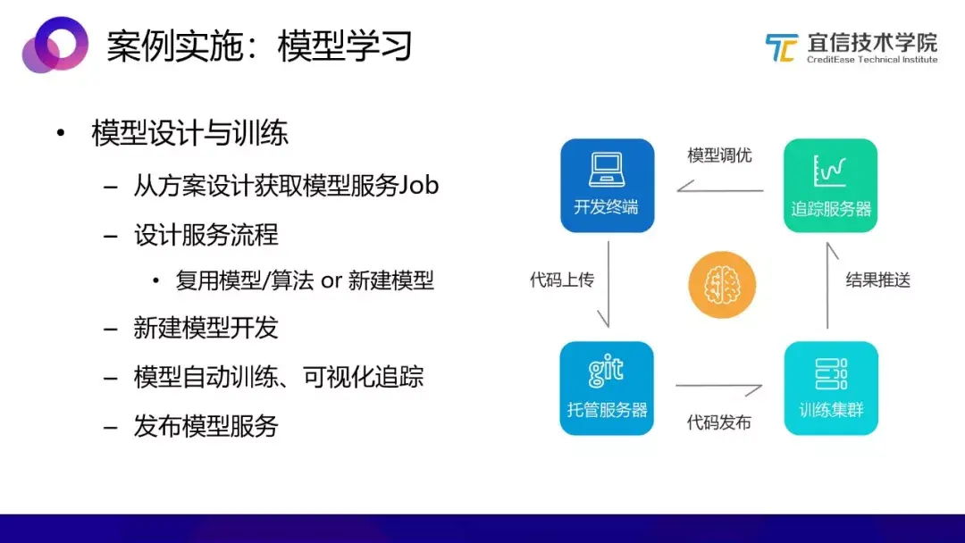 该模型可进行自动训练、可视化追踪。模型编排确定后,任务自动发送给工程师,可以在终端上通过交互式编程界面进行开发,之后对代码进行上传,在托管服务器可以将代码直接发布到训练集群上,自动进行训练,之后将训练结果推送到追踪服务器上,获取相关数据进行模型调优反复迭代,同时追踪服务器会记录每一次指标及模型,可选择最优的模型发布给监控中心。