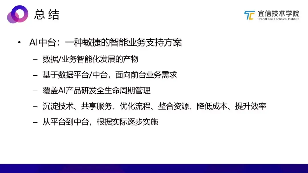 通过AI中台沉淀技术、共享服务、优化流程、整合资源、降低成本、提升效率是我们构建AI中台的最终目标,要想实现这一目标,还需要一个比较漫长的探索和实践过程。