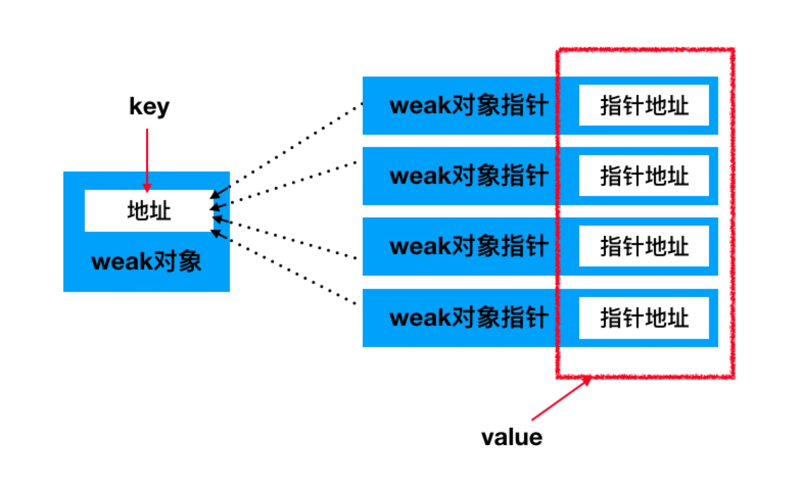 为什么value是数组?因为一个对象可能被多个弱引用指针指向。