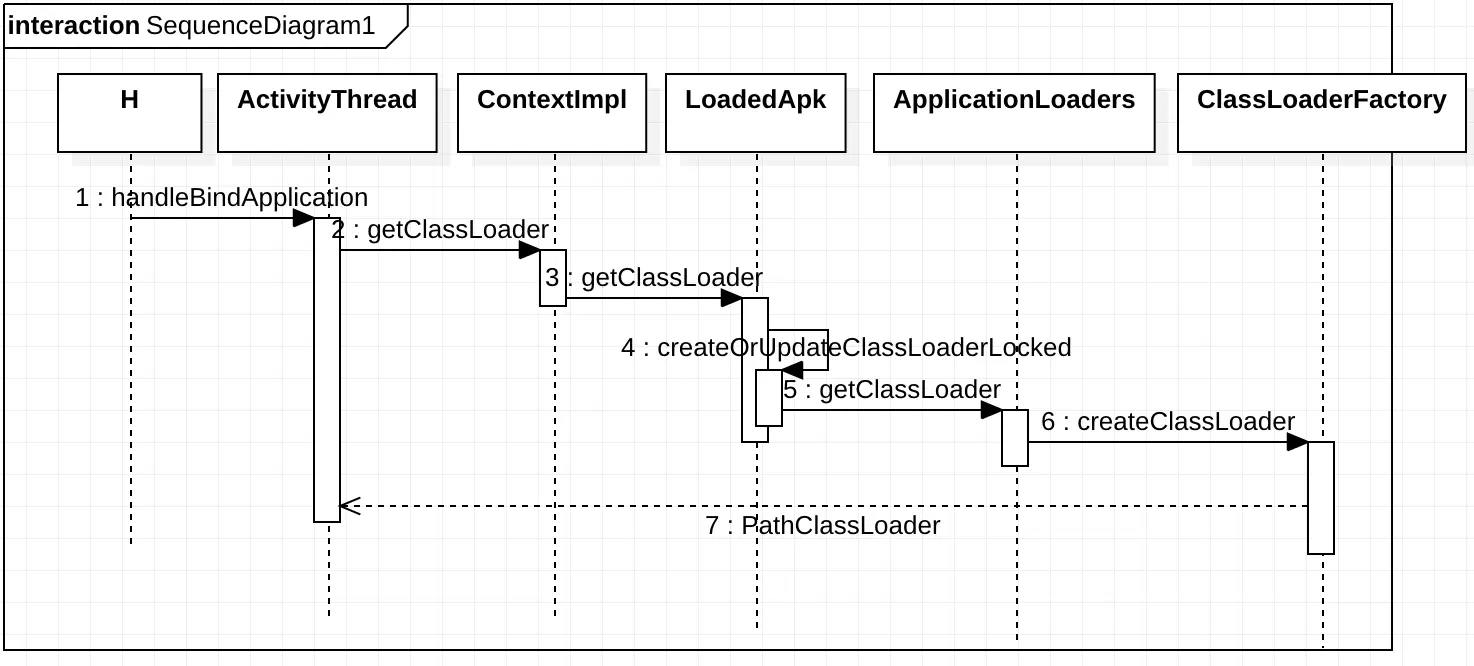 在ActivityThread中ApplicationThread的bindApplication方法中发送消息BIND_APPLICATION给H,H也是ActivityThread的内部类,它继承了Handler,然后H调用ActivityThread的handleBindApplicationf方法,然后ActivityThread处理该消息时经过层层调用,最后返回了PathClassLoader。