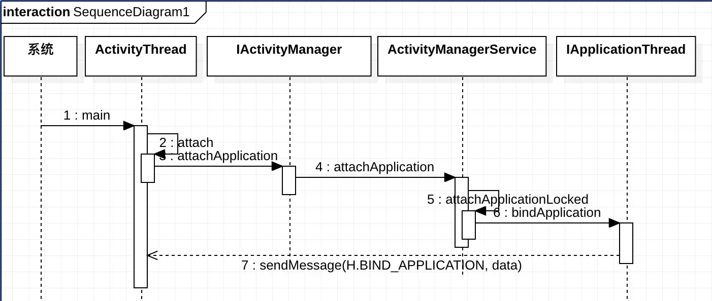 可以看到ActivityThread有个静态main方法,它经过层层调用并且经过IActivityManager这个IPC操作,调用到了AMS的一些方法,然后AMS再经过IApplicationThread这个IPC操作,调用到了ActivityThread的ApplicationThread的bindApplication方法。