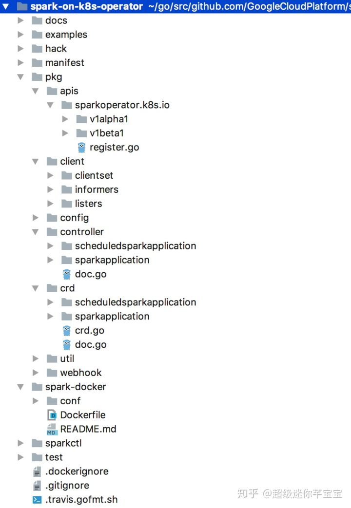 有了这个知识储备,那么我们回过头来看Spark Operator的代码,结构基本就比较明晰了。核心的代码逻辑都在pkg下,其中apis下面主要是定义了不同版本的API;client目录下主要是自动生成的client-go的SDK;crd目录下主要是定义的两个自定义资源sparkapplication和scheduledsparkapplication的结构。controller目录下主要定义的就是这个operator的生命周期管理的逻辑;config目录下主要处理spark config的转换。了解一个Operator能力最快捷的方式,就是查看CRD的定义。在Spark Operator中定义了sparkapplication和scheduledsparkapplication两个CRD,他们之间有什么区别呢?